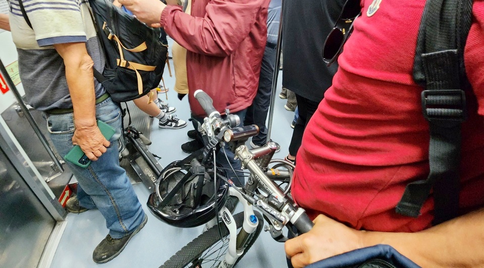 성남 모란에서 5시 30분에 출발하는 지하철 8호선 암사행 첫 열차다. 장지역에서 자전거와 전동킥보드를 갖고 각각 60대와 50대 남성이 탑승했다, 지하철 첫차가 만원이다. 게다가 1~8호선의 경우 평일 일반 자전거를 가지고 이용할수 없다. 접이식 자전거만 가능하다. [사진=정수남 기자]