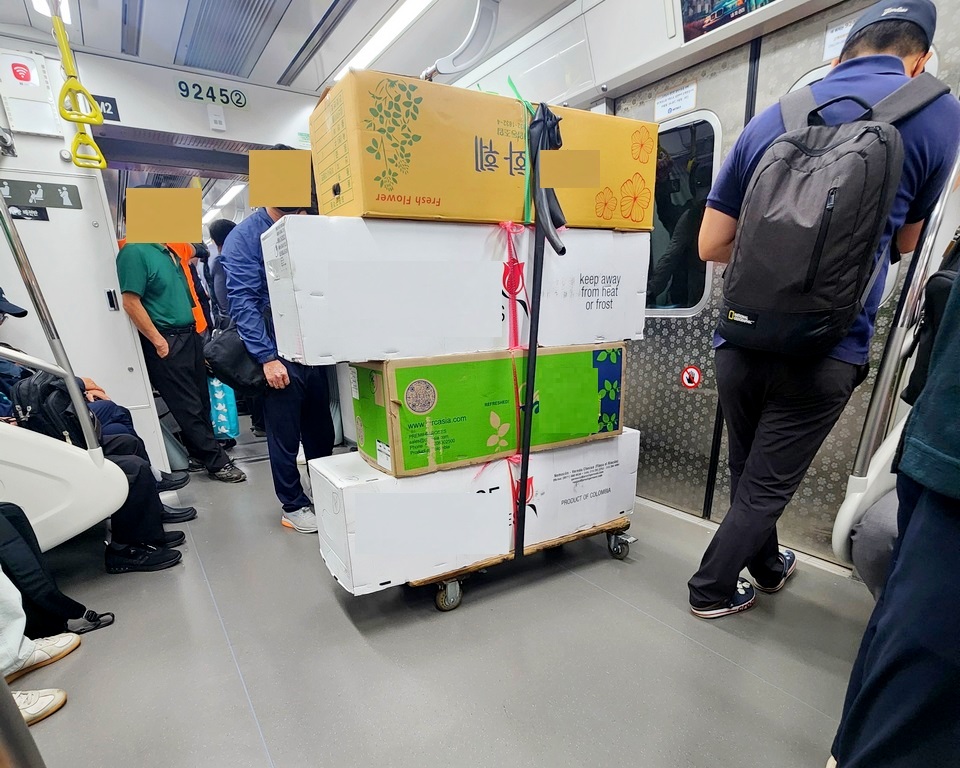 민자인 9호선도 별반 다르지 않다. 70대 남성이 고속터미널 역애서 대형 꽃상자를 가지고 탑승했다. 서울지하철의 경우 화물이 나이라 여객이다. 김포공항행 첫 급행인 이 열차 역시 만원이다. [사진=정수남 기자]