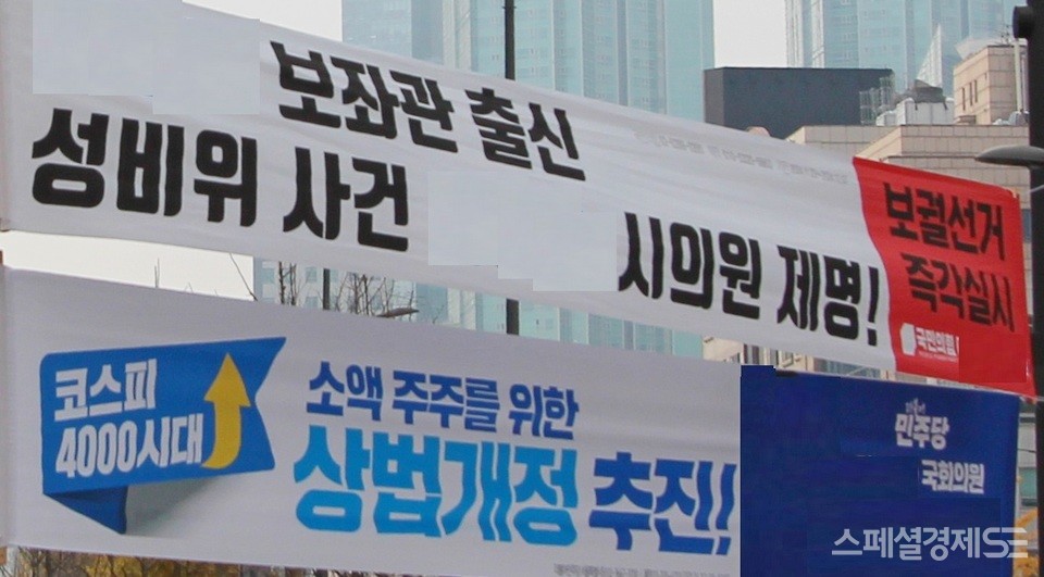 이곳을 지역구로 하는 더불어민주당 J 의원이 상법 개정을 추진한다는 현수막을 걸었다.